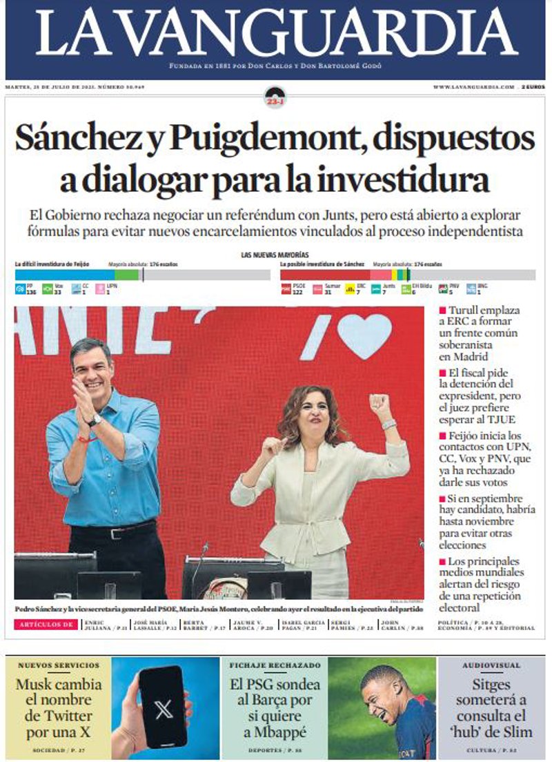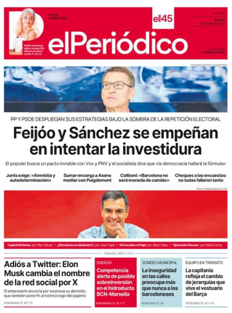 EL PERIÓDICO: "Feijóo y Sánchez se empeñan en intentar la investidura"; "Adiós a Twitter: Elon Musk cambia el nombre de la red social por X"; "Competencia alerta de posible sobreinversión en el hidroducto BCN-Marsella"; "La inseguridad en las calles preocupa más que nunca a los barceloneses"; "La capitanía refleja el cambio de jerarquías que vive el vestuario del Barça".