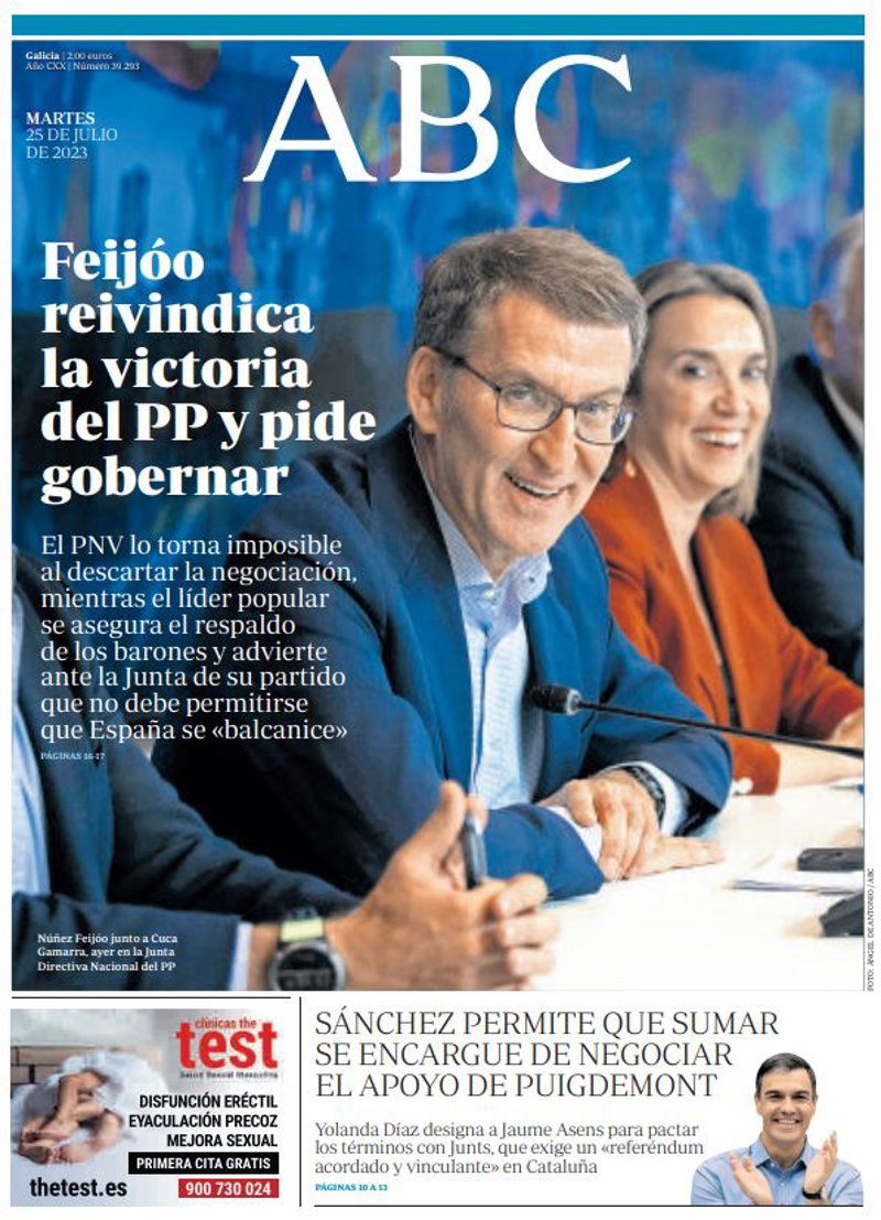 ABC: "Feijóo reivindica la victoria del PP y pide gobernar"; "Sánchez permite que Sumar se encargue de negociar el apoyo de Puigdemont".