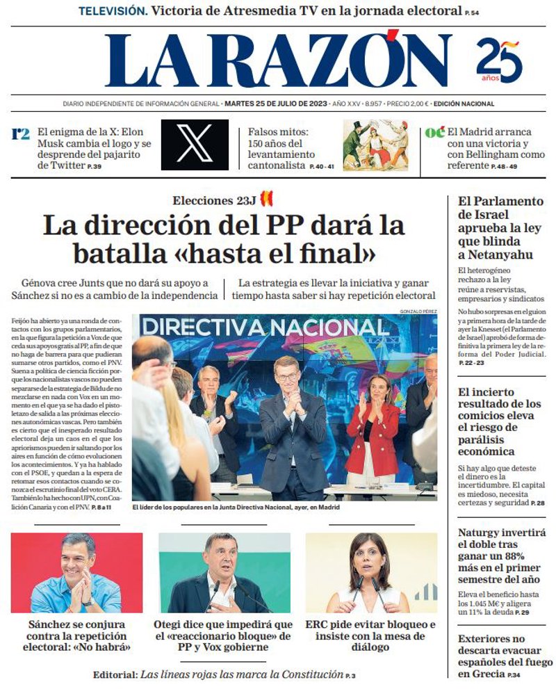 LA RAZÓN: "La dirección del PP dará la batalla "hasta el final""; "El Parlamento de Israel aprueba la ley que blinda a Netanyahu"; "El incierto resultado de los comicios eleva el riesgo de parálisis económica"; "Naturgy invertirá el doble tras ganar un 88% más en el primer semestre del año"; "Exteriores no descarta evacuar españoles del fuego en Grecia".