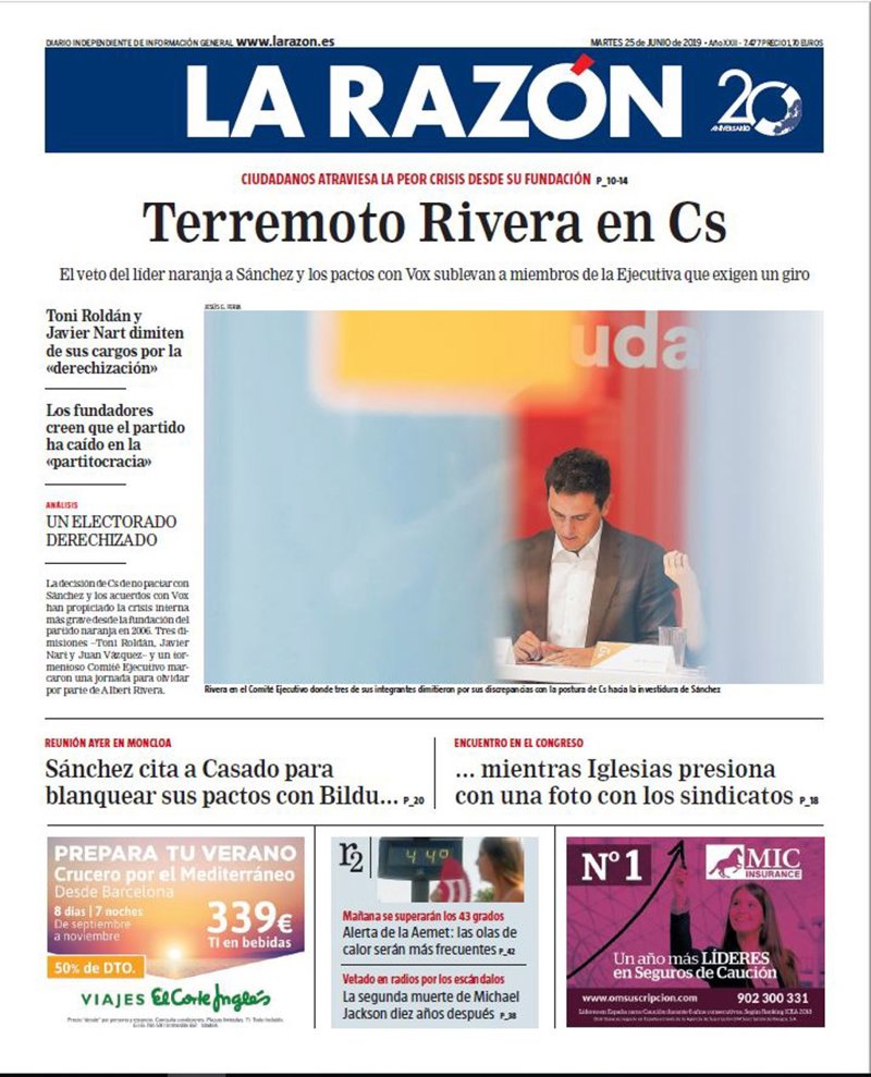 LA RAZÓN: "Terremoto Rivera en Cs. Toni Roldán y Javier Nart dimiten de sus cargos por la "derechización". Los fundadores creen que el partido ha caído en la "partitocracia""; "Sánchez cita a Casado para blanquear sus pactos con Bildu ... mientras Iglesias presiona con una foto con los sindicatos"; "Alerta de la Aemet: las olas de calor serán más frecuentes"; "La segunda muerte de Michael Jackson diez años después".