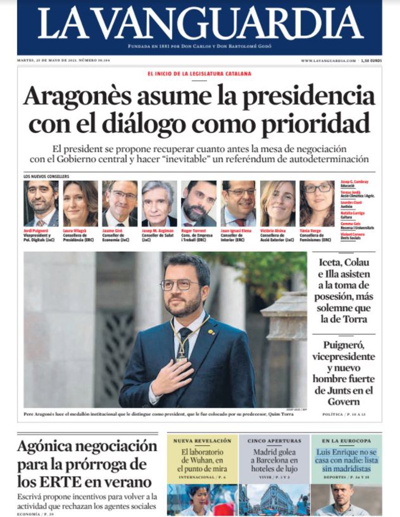 LA VANGUARDIA: "Aragonès asume la presidencia con el diálogo como prioridad"; "Agónica negociación para la prórroga de los ERTE en verano"; "Iceta, Colau e Illa asisten a la toma de posesión, más solemne que la de Torra"; "Puigneró, vicepresidente y nuevo hombre fuerte de Junts en el Govern"; "El laboratorio de Wuhan, en el punto de mira"; "Madrid golea a Barcelona en hoteles de lujo"; "Luis Enrique no se casa con nadie: lista sin madridistas".