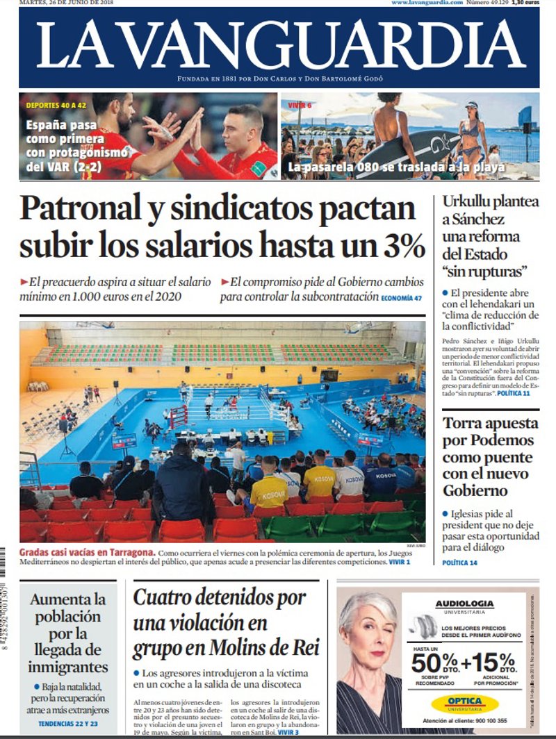 EL PERIÓDICO: "Pacto social para subir los salarios hasta un 3%"; "La Roja, a octavos"; "Sánchez inicia con Urkullu el deshielo territorial"; "Cuatro detenidos por una violación grupal y dos menores, por agresión sexual".