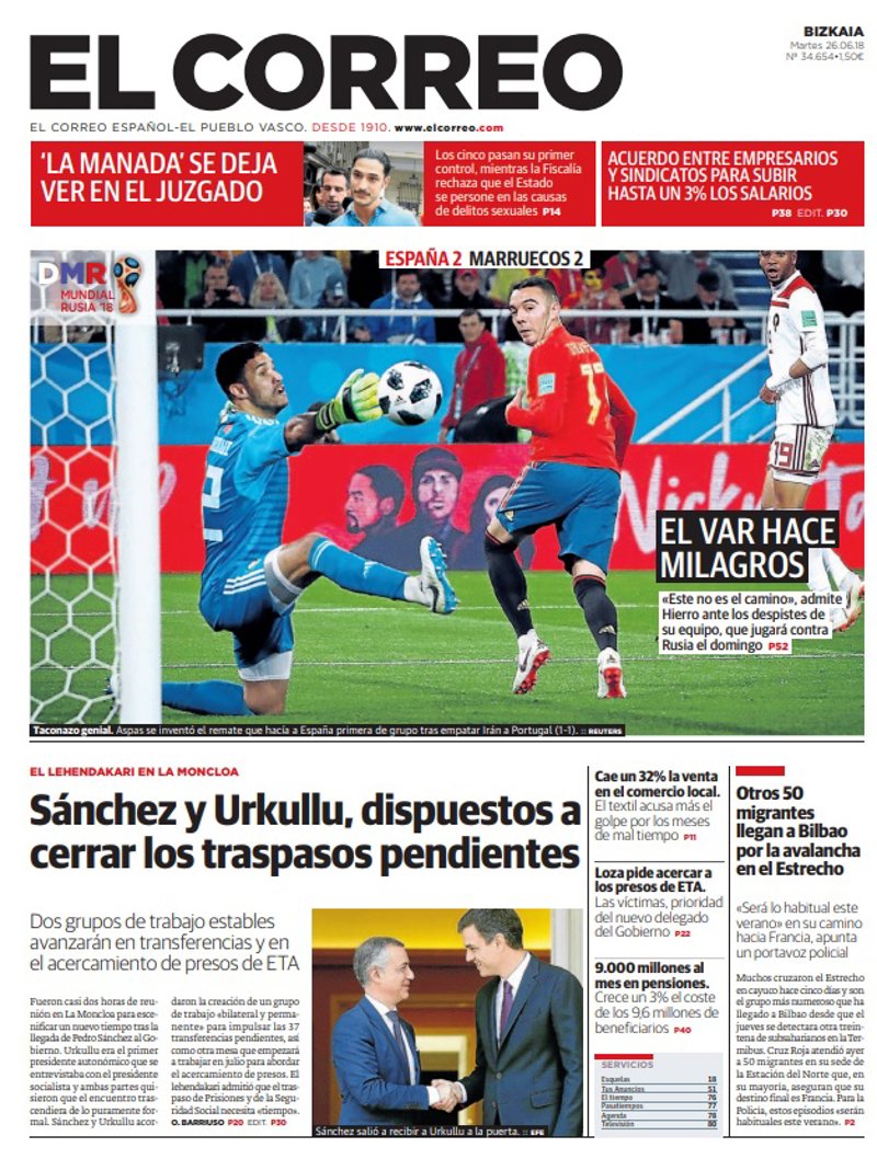 EL CORREO: "El VAR hace milagros"; "Sánchez y Urkullu, dispuestos a cerrar los traspasos pendientes"; "Otros 50 migrantes llegan a Bilbao por la avalancha en el Estrecho"; "Loza pide acercar a los presos de ETA".