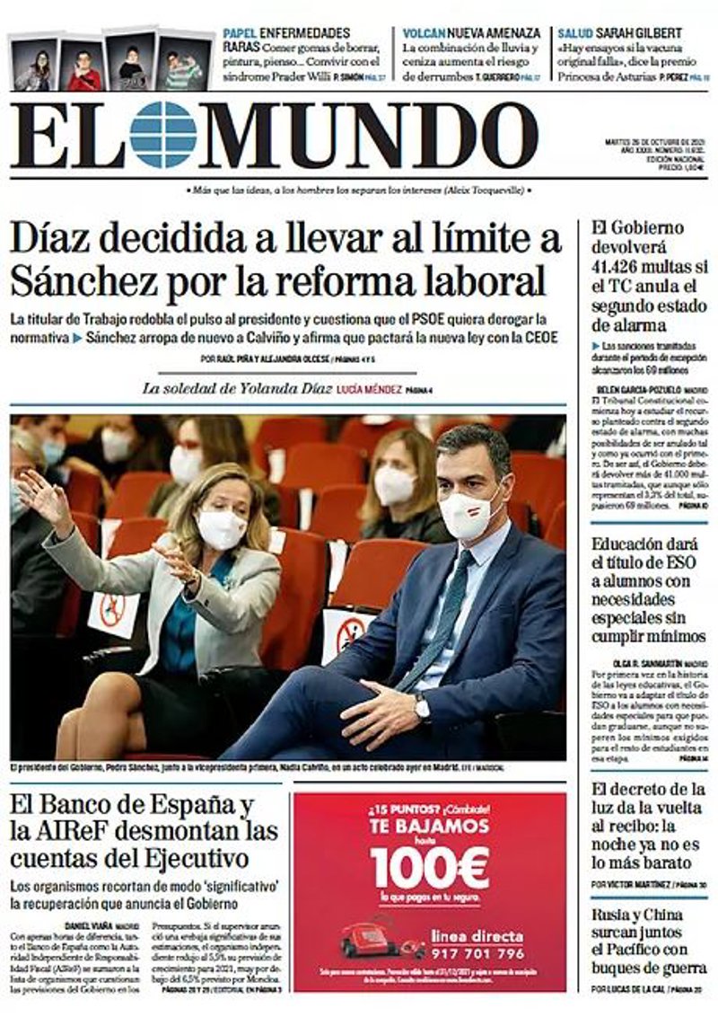 EL MUNDO: "Díaz decidida a llevar al límite a Sánchez por la reforma laboral"; "El Banco de España y la AIRef desmontan las cuentas del Ejecutivo"; "El Gobierno devolverá 41.426 multas si el TC anula el segundo estado de alarma"; "Educación dará el título de ESO a alumnos con necesidades especiales sin cumplir mínimos"; "El decreto de la luz da la vuelta al recibo: la noche ya no es lo más barato"; "Rusia y China surcan juntos el Pacífico con buques de guerra".