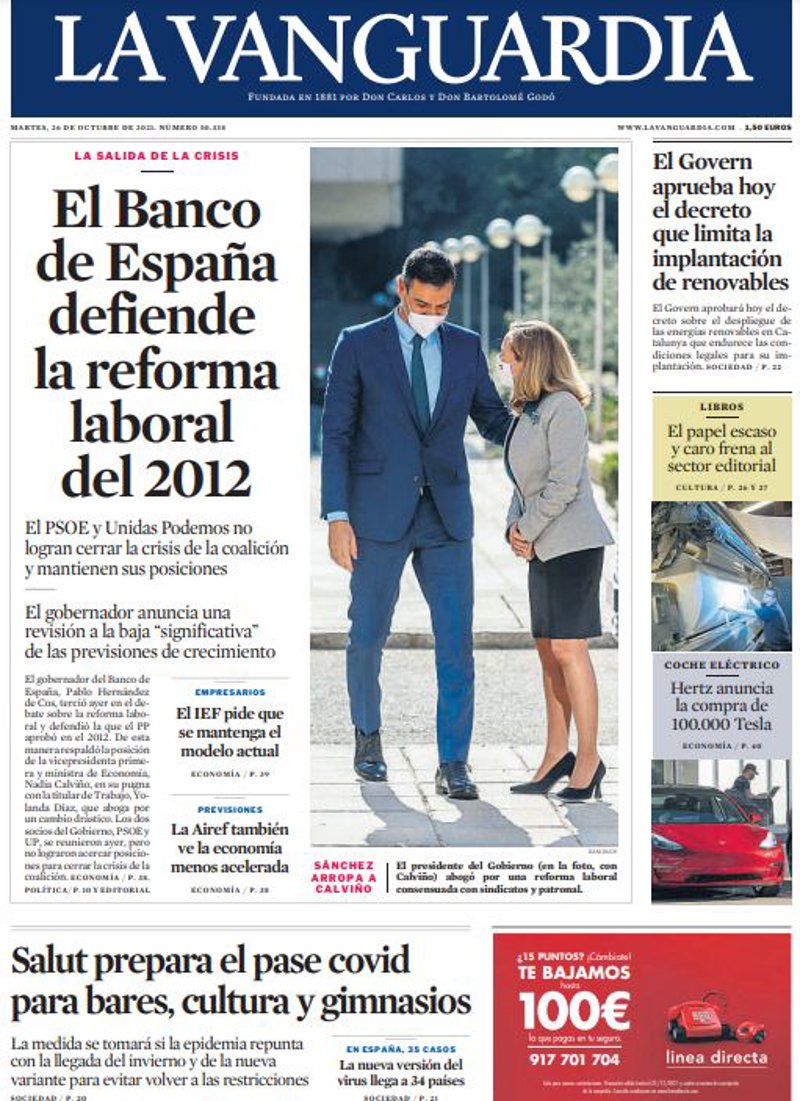 LA VANGUARDIA: "El Banco de España defiende la reforma laboral del 2012"; "Salut prepara el pase covid para bares, cultura y gimnasios"; "El Govern aprueba hoy el decreto que limita la implantación de renovables".