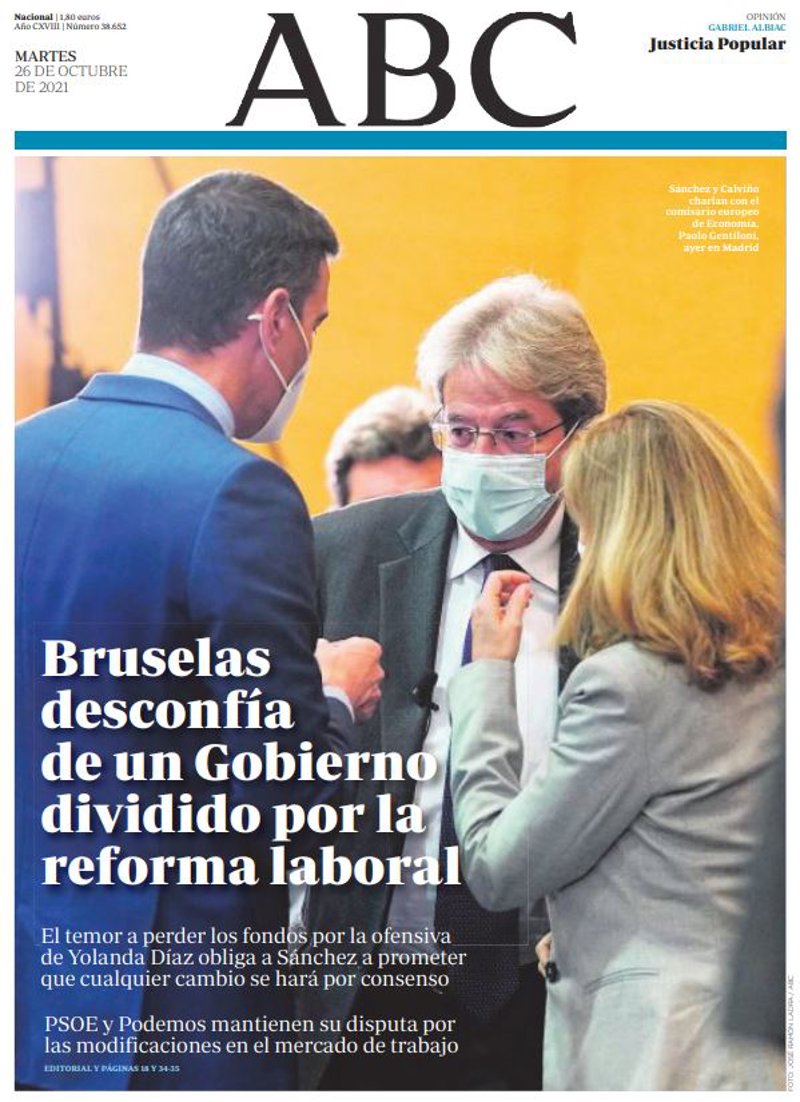 ABC: "Bruselas desconfía de un Gobierno dividido por la reforma laboral. El temor a perder los fondos por la ofensiva de Yolanda Díaz obliga a Sánchez a prometer que cualquier cambio se hará por consenso. PSOE y Podemos mantienen su disputa por las modificaciones en el mercado de trabajo".