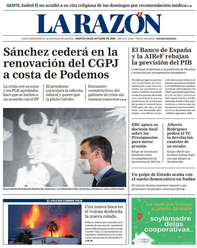 LA RAZÓN: "Sánchez cederá en la renovación del CGPJ a costa de Podemos"; "El Banco de España y la AIReF rebajan la previsión del PIB"; "ERC apura su decisión final sobre los Presupuestos para meter presión"; "Alberto Rodríguez pedirá al TC la devolución cautelar de su escaño"; "Un golpe de Estado acaba con el sueño democrático en Sudán"; "Una nueva boca en el volcán desborda la nueva colada".