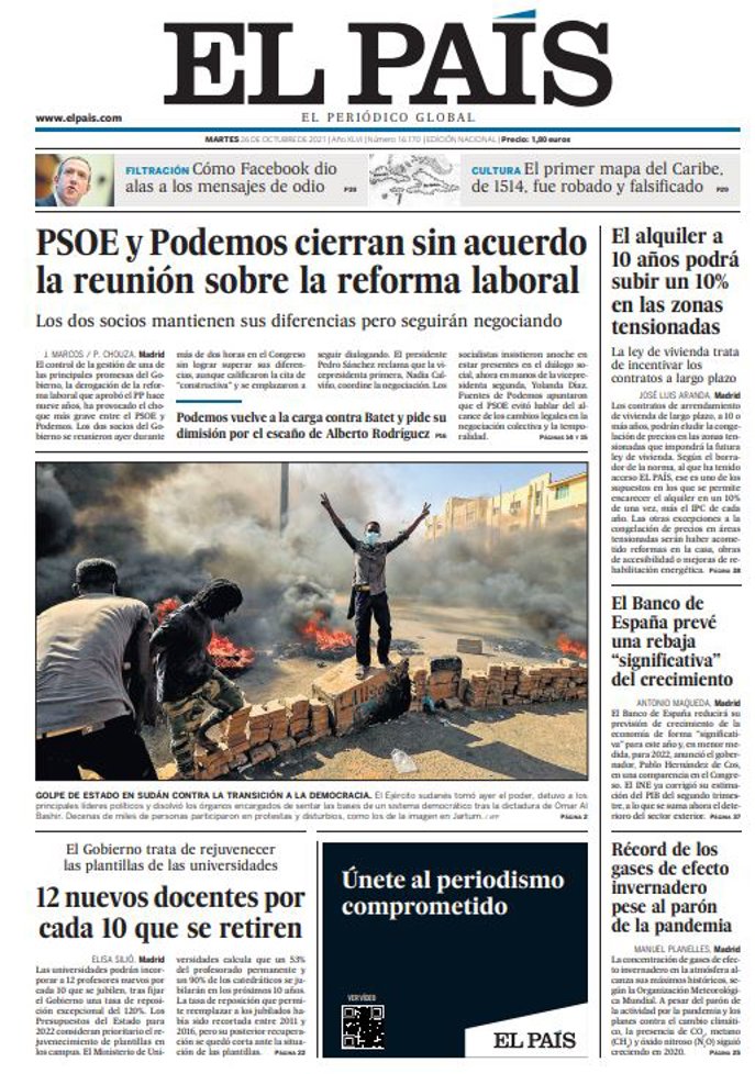 EL PAÍS: "PSOE y Podemos cierran sin acuerdo la reunión sobre la reforma laboral"; "12 nuevos docentes por cada 10 que se retiren"; "El alquiler a 10 años podrá subir un 10% en las zonas tensionadas"; "El Banco de España prevé una rebaja "significativa" del crecimiento"; "Récord de los gases de efecto invernadero pese al parón de la pandemia".