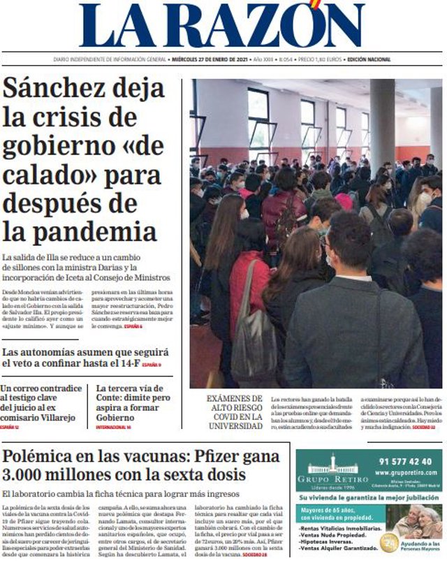 LA RAZÓN: "Sánchez deja la crisis de gobierno "de calado" para después de la pandemia"; "Las autonomías asumen que seguirá el veto a confinar hasta el 14-F"; "Un correo contradice al testigo clave del juicio al ex comisario Villarejo"; "La tercera vía de Conte: dimite pero aspira a formar Gobierno"; "Polémica en las vacunas: Pfizer gana 3.000 millones con la sexta dosis".