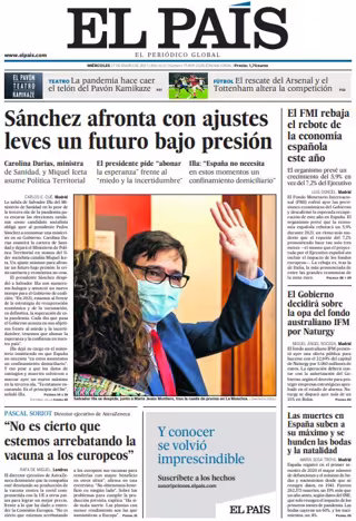 EL PAÍS: "Sánchez afronta con ajustes leves un futuro bajo presión"; "Pascal Soriot, director ejecutivo de AstraZeneca: "No es cierto que estemos arrebatando la vacuna a los europeos""; "El FMI rebaja el rebote de la economía española este año"; "El Gobierno decidirá sobre la opa del fondo australiano IFM por Naturgy"; "Las muertes en España suben a su máximo y se hunden las bodas y la natalidad".