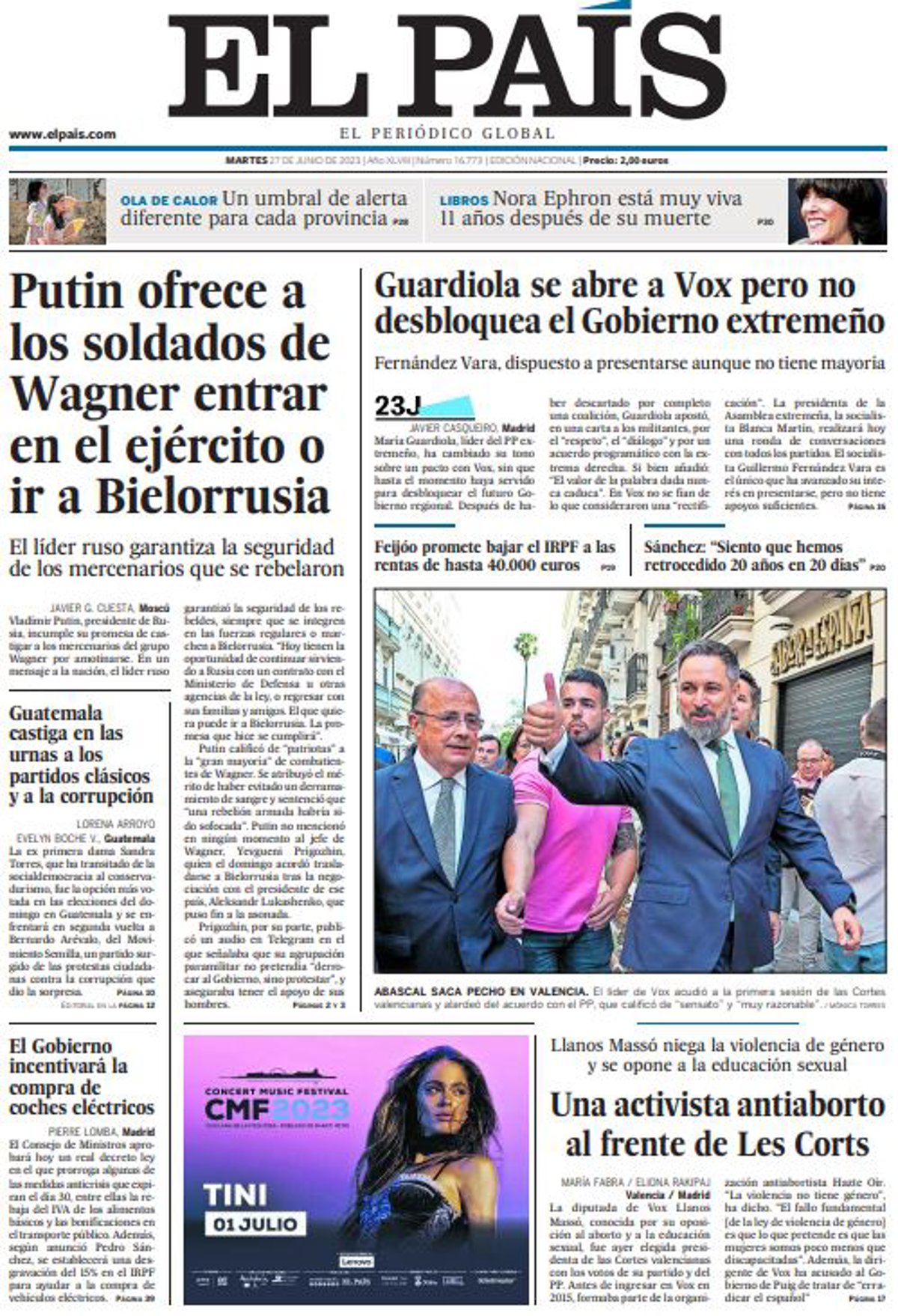 EL PAÍS: "Putin ofrece a los soldados de Wagner entrar en el ejército o ir a Bielorrusia"; "Guardiola se abre a Vox pero no desbloquea el Gobierno extremeño"; "Guatemala castiga en las urnas a los partidos clásicos y a la corrupción"; "El Gobierno incentivará la compra de coches eléctricos"; "Una activista antiaborto al frente de Les Corts".