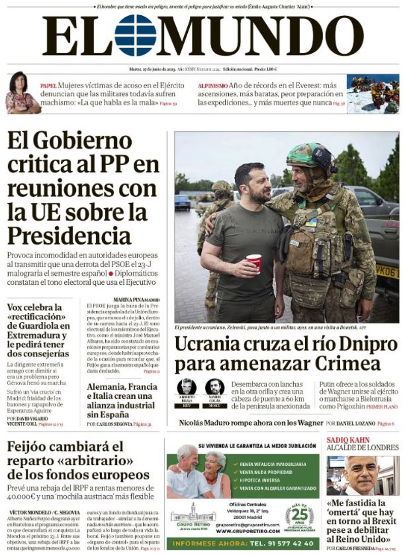 EL MUNDO: "El Gobierno critica al PP en reuniones con la UE sobre la Presidencia"; "Vox celebra la "rectificación" de Guardiola en Extremadura y le pedirá tener dos consejerías"; "Feijóo cambiará el reparto "arbitrario" de los fondos europeos"; "Ucrania cruza el río Dnipro para amenazar Crimea".