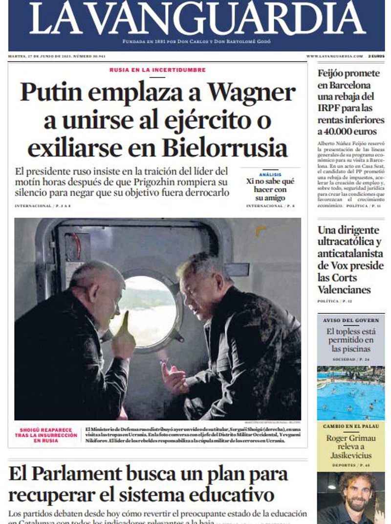 LA VANGUARDIA: "Putin emplaza a Wagner a unirse al ejército o exiliarse en Bielorrusia"; "El Parlament busca un plan para recuperar el sistema educativo".