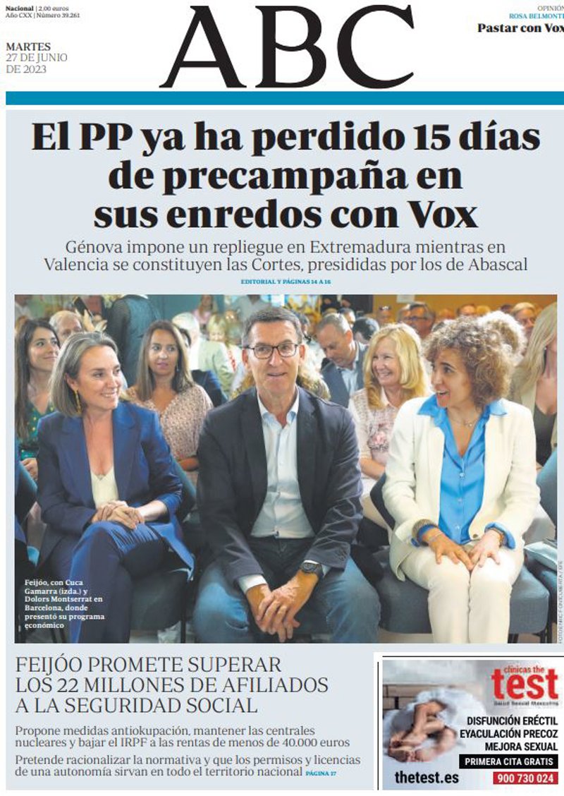ABC: "El PP ya ha perdido 15 días de precampaña en sus enredos con Vox. Génova impone un repliegue en Extremadura mientras en Valencia se constituyen las Cortes, presididas por los de Abascal"; "Feijóo promete superar los 22 millones de afiliados a la seguridad social".
