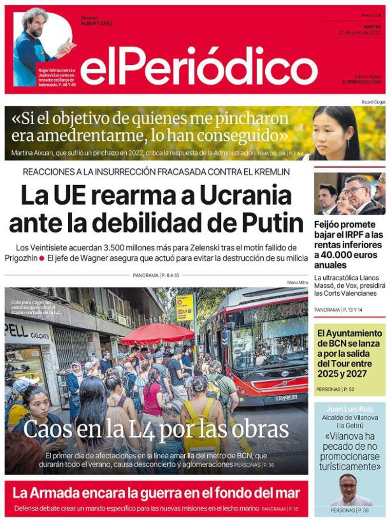 EL PERIÓDICO: "La UE rearma a Ucrania ante la debilidad de Putin"; "Caos en la L4 por las obras"; "La Armada encara la guerra en el fondo del mar"; "Feijóo promete bajar el IRPF a las rentas inferiores a 40.000 euros anuales"; "El Ayuntamiento de BCN se lanza a por la salida del Tour entre 2025 y 2027".