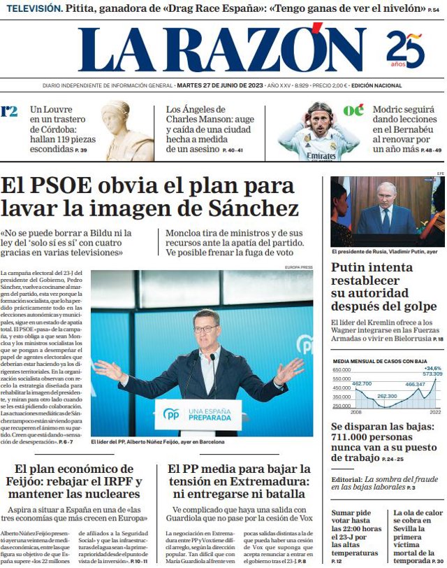 LA RAZÓN: "El PSOE obvia el plan para lavar la imagen de Sánchez"; "El plan económico de Feijóo: rebajar el IRPF y mantener las nucleares"; "El PP media para bajar la tensión en Extremadura: ni entregarse ni batalla"; "Putin intenta restablecer su autoridad después del golpe"; "Se disparan las bajas: 711.000 personas nunca van a su puesto de trabajo"; "Sumar pide votar hasta las 22:00 horas el 23-J por las altas temperaturas"; "La ola de calor se cobra en Sevilla la primera víctima mortal de la temporada".