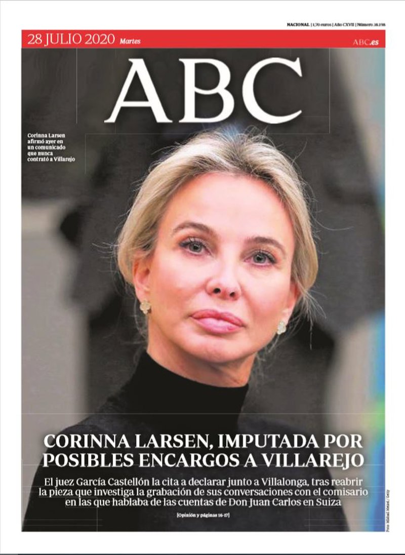 ABC: "Corinna Larsen, imputada por posibles encargos a Villarejo. El juez García Castellón la cita a declarar junto a Villalonga, tras reabrir la pieza que investiga la grabación de sus conversaciones con el comisario en las que hablaba de las cuentas de Don Juan Carlos en Suiza".