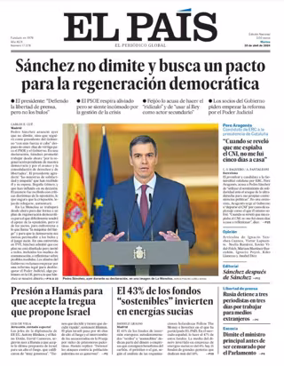 EL PAÍS: "Sánchez no dimite y busca un pacto para la regeneración democrática"; "Presión a Hamás para que acepte la tregua que propone Israel"; "El 43% de los fondos "sostenibles" invierten en energías sucias"; "Aragonès: Cuando se reveló que me espiaba el CNI, no me fui cinco días a casa"; "Rusia detiene a tres periodistas en tres días por trabajar para medios extranjeros"; "Dimite el ministro principal antes de ser censurado por el Parlamento".