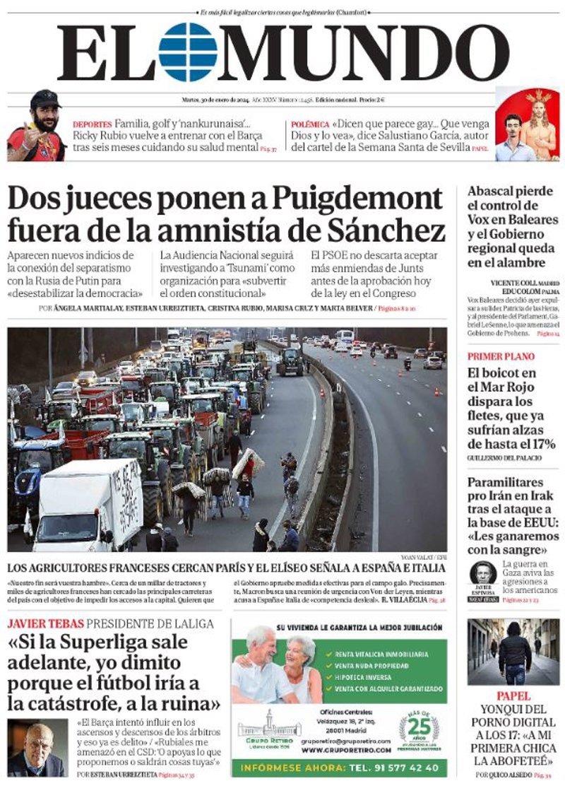 EL MUNDO: "Dos jueces ponen a Puigdemont fuera de la amnistía de Sánchez"; "Tebas: "Si la Superliga sale adelante, yo dimito porque el fútbol iría a la catástrofe, a la ruina"; "Abascal pierde el control de Vox en Baleares y el Gobierno regional queda en el alambre"; "El boicot en el Mar Rojo dispara los fletes, que ya sufrían alzas de hasta el 17%"; "Paramilitares pro Irán en Irak tras el ataque a la base de EEUU: "Les ganaremos con la sangre".