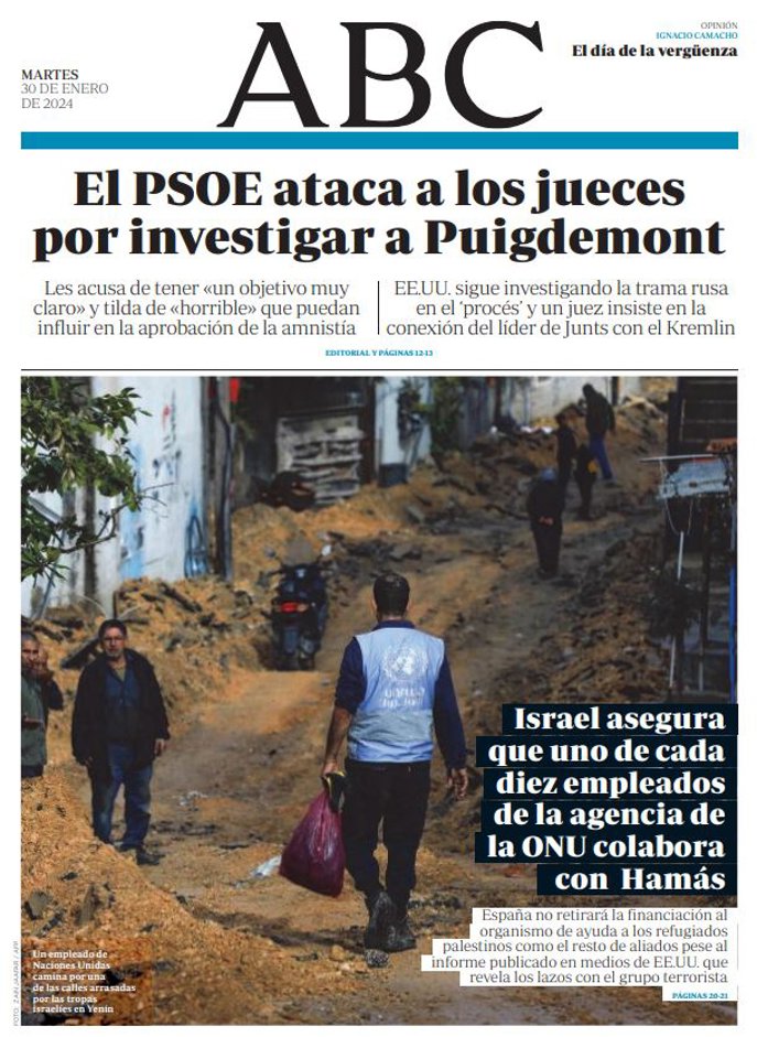 ABC: "El PSOE ataca a los jueces por investigar a Puigdemont"; "Israel asegura que uno de cada diez empleados de la agencia de la ONU colabora con Hamás".