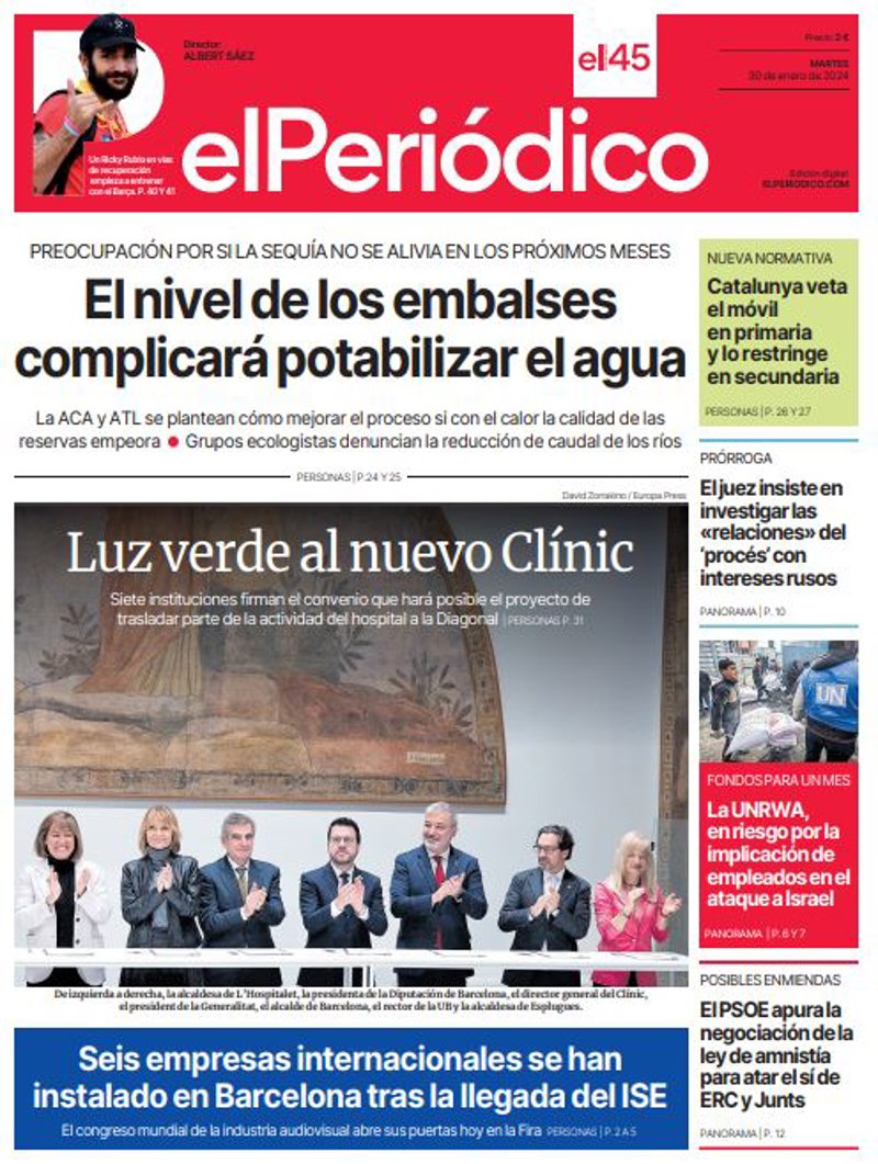 EL PERIÓDICO: "El nivel de los embalses complicará potabilizar el agua"; "Luz verde al nuevo Clínic"; "Seis empresas internacionales se haninstalado en Barcelona tras la llegada del ISE"; "Catalunya veta el móvilen primaria y lo restringe en secundaria"; "El juez insiste en investigar las "relaciones" del 'procés' con intereses rusos"; "La UNRWA, en riesgo por la implicación de empleados en el ataque a Israel"; "El PSOE apura la negociación de la ley de amnistía para atar el sí de ERC y Junts".