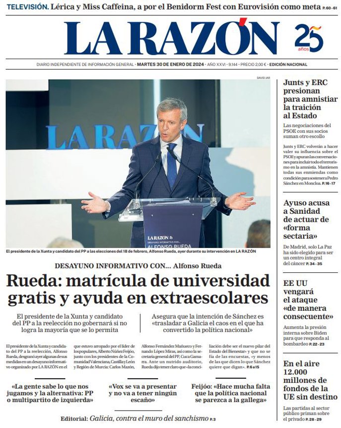LA RAZÓN: "Rueda: matrícula de universidad gratis y ayuda en extraescolares"; "Junts y ERC presionan para amnistiar la traición al Estado"; "Ayuso acusa a Sanidad de actuar de "forma sectaria""; "EE UU vengará el ataque "de manera consecuente""; "En el aire 12.000 millones de fondos de la UE sin destino".