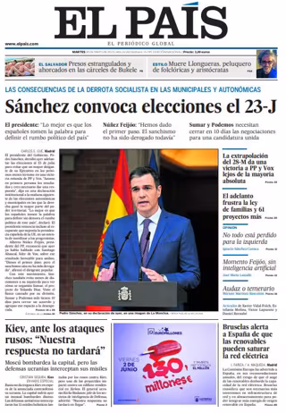 EL PAÍS: "Sánchez convoca elecciones el 23-J"; "Kiev, ante los ataques rusos: "Nuestra respuesta no tardará""; "La extrapolación del 28-M da una victoria a PP y Vox lejos de la mayoría absoluta"; "El adelanto frustra la ley de familias y 61 proyectos más"; "Bruselas alerta a España de que las renovables pueden saturar la red eléctrica".