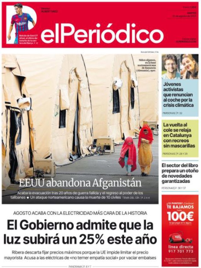 EL PERIÓDICO: "El Gobierno admite que la luz subirá un 25% este año"; "EEUU abandona Afganistán"; "Jóvenes activistas que renuncian al coche por la crisis climática"; "La vuelta al cole se relaja con Catalunya con recreos sin mascarillas"; "El sector del libro prepara un otoño de novedades garantizadas".