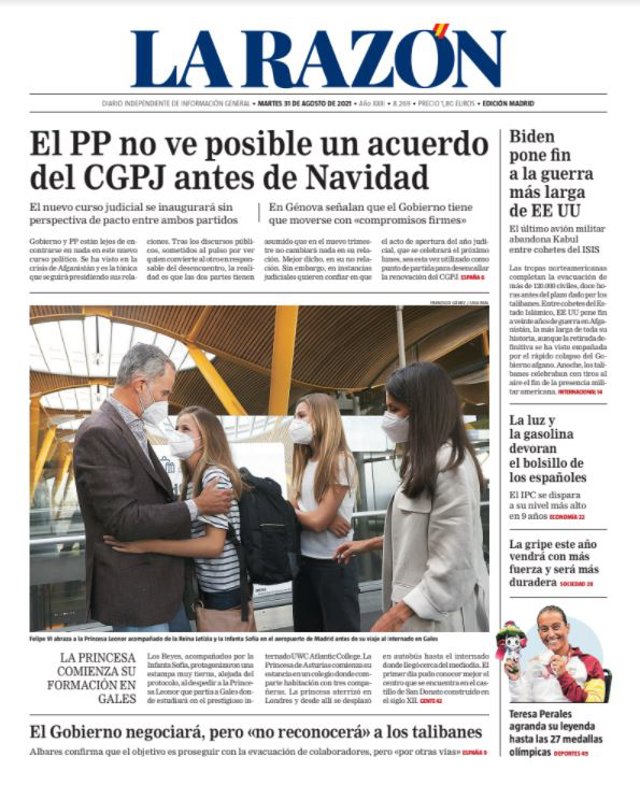 LA RAZÓN: "El PP no ve posible un acuerdo del CGPJ antes de Navidad"; "Biden pone fin a la guerra más larga de EE UU"; "La luz y la gasolina devoran el bolsillo de los españoles"; "El Gobierno negociará, pero 'no reconocerá' a los talibanes"; "La Princesa comienza su formación en Gales"; "Teresa Perales agranda su leyenda hasta las 27 medallas olímpicas".