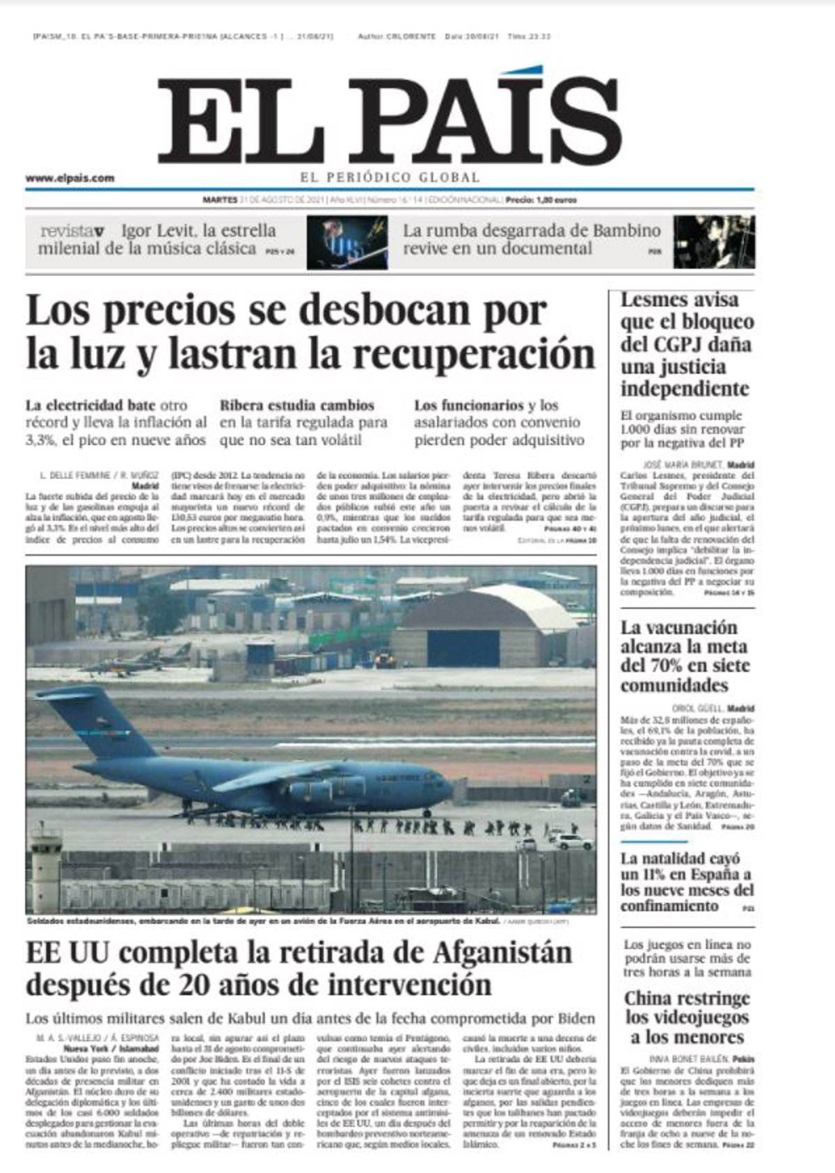 EL PAÍS: "Los precios se desbocan por la luz y lastran la recuperación"; "Lesmes avisa que el bloqueo del CGPJ daña una justicia independiente"; "EEUU completa la retirada de Afganistán después de 20 años de intervención"; "La vacunación alcanza la meta del 70% en siete comunidades"; "La natalidad cayó un 11% en España a los nueve meses del confinamiento"; "China restringe los videojuegos a los menores"; "Igor Levit, la estrella milenial de la música clásica".