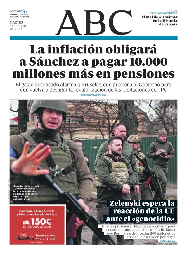 ABC: "La inflación obligará a Sánchez a pagar 10.000 millones más en pensiones"; "Zelenski espera la reacción de la UE ante el genocidio".