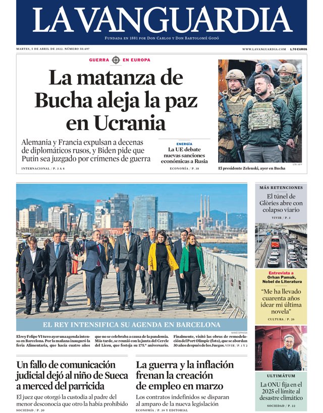 LA VANGUARDIA: "La matanza de Bucha aleja la paz en Ucrania"; "Un fallo de comunicación judicial dejó al niño de Sueca a merced del parricida"; "La guerra y la inflación frenan la creación de empleo en marzo".