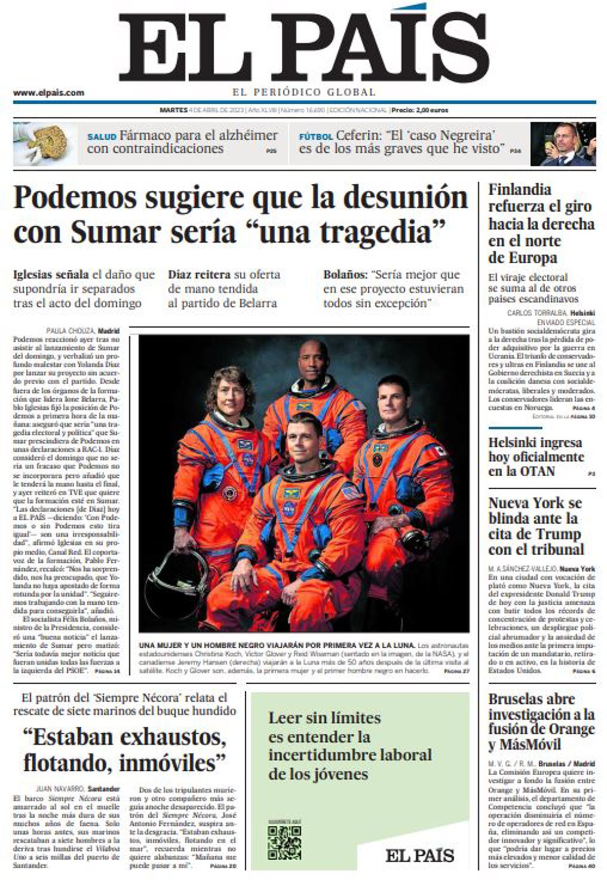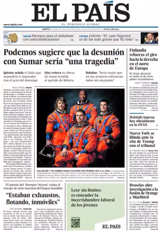 EL PAÍS: "Podemos sugiere que la desunión con Sumar sería "una tragedia""; """Estaban exhaustos, flotando, inmóviles""; "Finlandia refuerza el giro hacia la derecha en el norte de Europa"; "Helsinki ingresa hoy oficialmente en la OTAN"; "Nueva York se blinda ante la