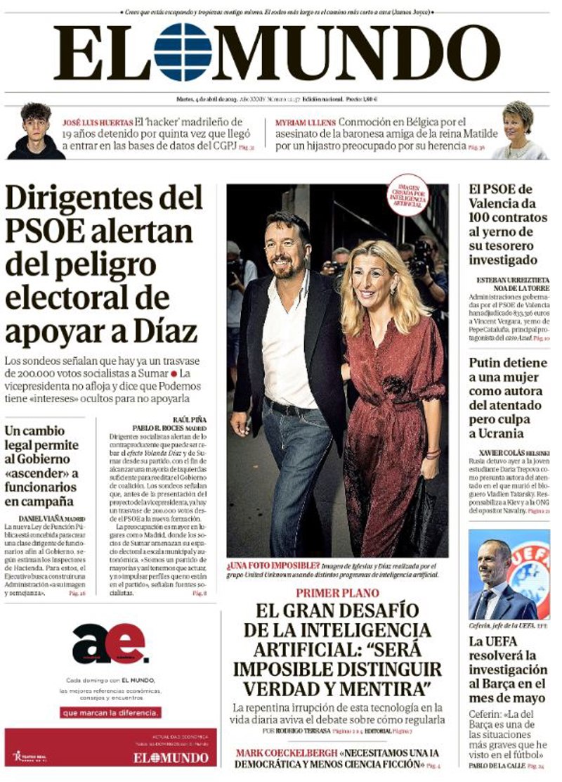 EL MUNDO: "Dirigentes del PSOE alertan del peligro electoral de apoyar a Díaz"; "Un cambio legal permite al Gobierno "ascender" a funcionarios en campaña"; "El PSOE de Valencia da 100 contratos al yerno de su tesorero investigado"; "Putin detiene a una mujer como autora del atentato pero culpa a Ucrania"; "La UEFA resolverá la investigación al Barça en el mes de mayo".