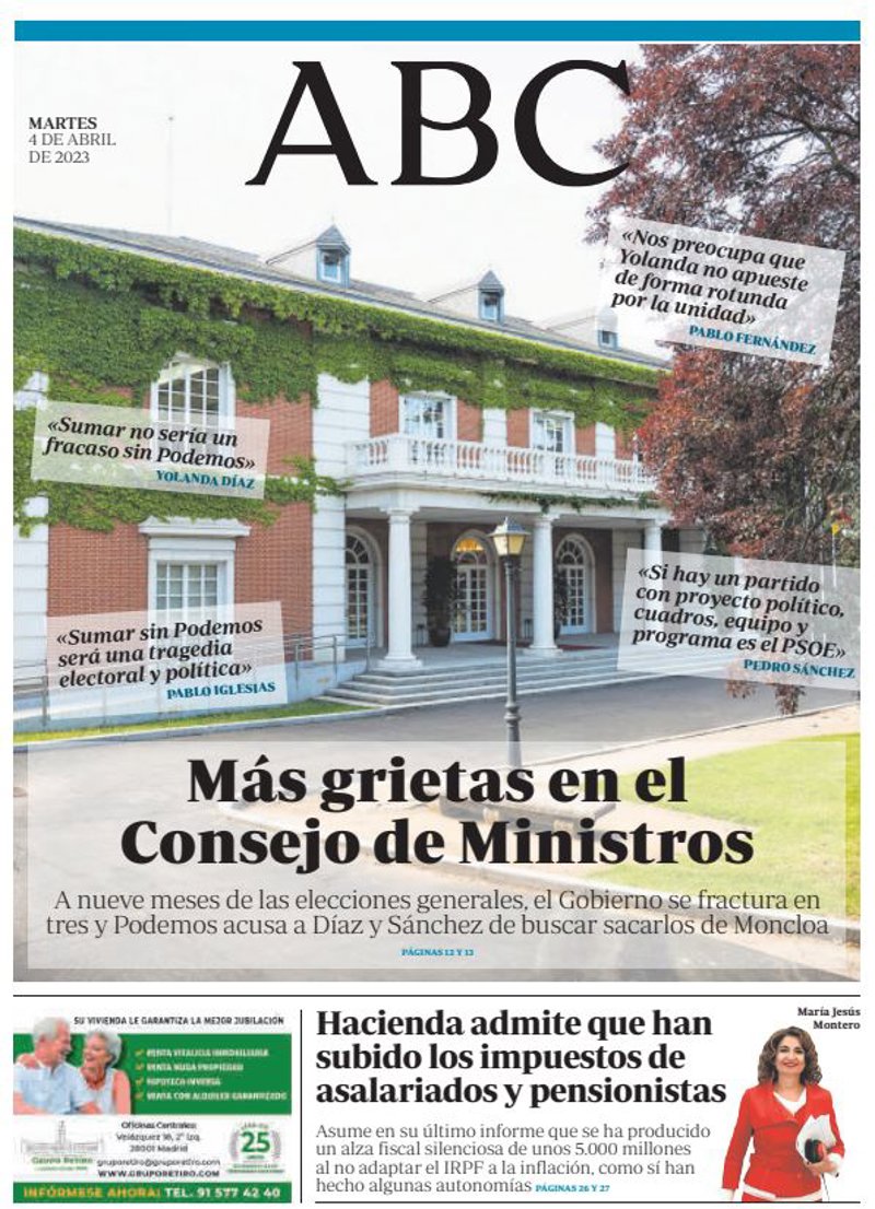 ABC: "Más grietas en el Consejo de Ministros. A nueve meses de las elecciones generales, el Gobierno se fractura en tres y Podemos acusa a Díaz y Sánchez de buscar sacarlos de Moncloa"; "Hacienda admite que han subido los impuestos de asalariados y pensionistas. Asume en su último informe que se ha producido un alza fiscal silenciosa de unos 5.000 millones al no adaptar el IRPF a la inflación, como sí han hecho algunas autonomías".