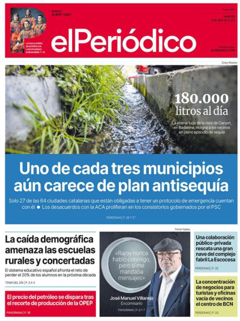 EL PERIÓDICO: "Uno de cada tres municipios aún carece de plan antisequía"; "La caída demográfica amenaza las escuelas rurales y concertadas"; "Una colaboración público-privada rescata una gran nave del complejo fabril La Escocesa"; "La concentración de negocios para turistas y oficinas vacía de vecinos el centro de BCN"; "José Manuel Villarejo, excomisario: "Rajoy nunca habló conmigo, pero sí me mandaba mensajes"".