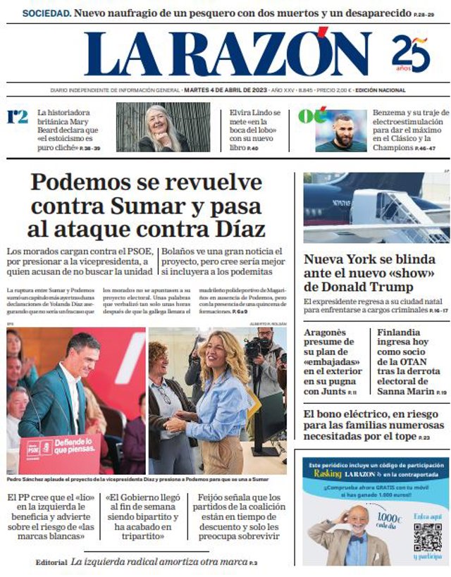LA RAZÓN: "Podemos se revuelve contra Sumar y pasa al ataque contra Díaz"; "Nueva York se blinda ante el nuevo "show" de Donald Trump"; "Aragonès presume de su plan de "embajadas" en el exterior en su pugna con Junts"; "Finlandia ingresa hoy como socio de la OTAN tras la derrota electoral de Sanna Marin"; "El bono eléctrico, en riesgo para las familias numerosas necesitadas por el tope".