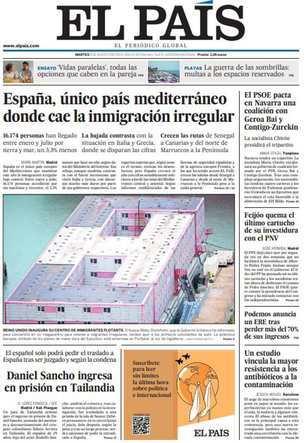 EL PAÍS: "España, único país mediterráneo donde cae la inmigración irregular"; "Daniel Sancho ingresa en prisión en Tailandia"; "El PSOE pacta en Navarra una coalición con Geroa Bai y Contigo-Zurekin"; "Feijóo quema el último cartucho de su investidura con el PNV"; "Podemos anuncia un ERE tras perder más del 70% de sus ingresos"; "Un estudio vincula la mayor resistencia a los antibióticos a la contaminación".