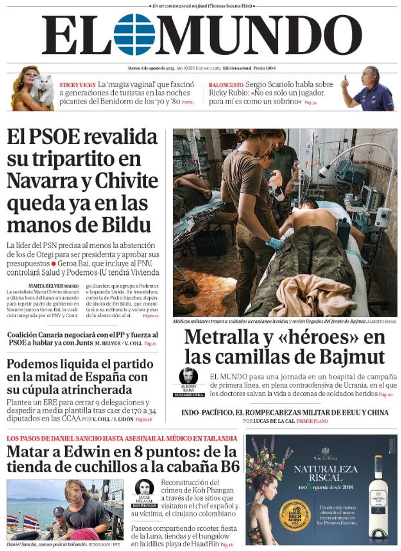 EL MUNDO: "El PSOE revalida su tripartito en Navarra y Chivite queda ya en las manos de Bildu"; "Metralla y "héroes" en las camillas de Bajmut"; "Podemos liquida el partido en la mitad de España con su cúpula atrincherada"; "Matar a Edwin en 8 puntos: de la tienda de cuchillos a la cabaña B6".