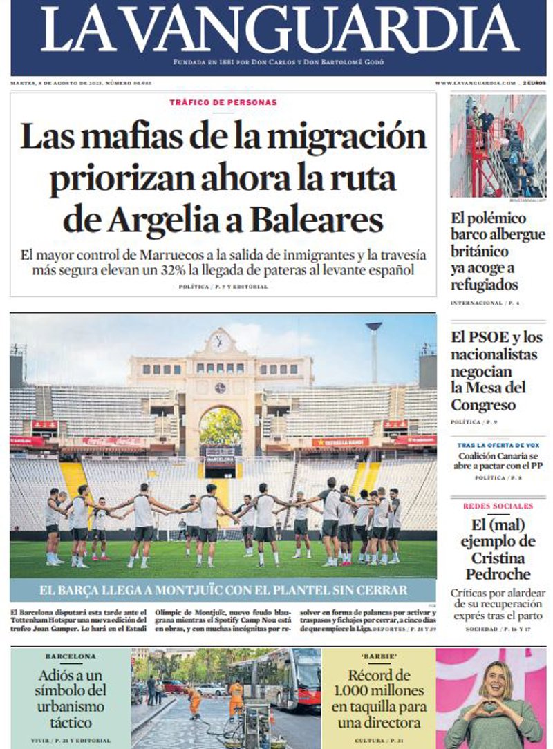 LA VANGUARDIA: "Las mafias de la migración priorizan ahora la ruta de Argelia a Baleares"; "El polémico barco albergue británico ya acoge a refugiados"; "El PSOE y los nacionalistas negocian la Mesa del Congreso"; "El (mal) ejemplo de Cristina Pedroche".