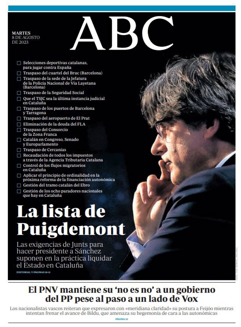 ABC: "La lista de Puigdemont. Las exigencias de Junts para hacer presidente a Sánchez suponen en la práctica liquidar el Estado en Cataluña"; "El PNV mantiene su 'no es no' a un gobierno del PP pese al paso a un lado de Vox. Los nacionalistas vascos reiteran que expresaron con "meridiana claridad" su postura a Feijóo mientras intentan frenar el avance de Bildu, que amenaza su hegemonía de cara a las autonómicas".