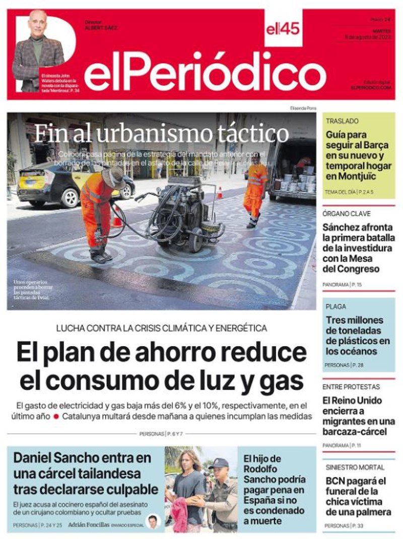 EL PERIÓDICO: "El plan de ahorro reduce el consumo de luz y gas"; "Daniel Sancho entra en una cárcel tailandesa tras declarase culpable"; "Guía para seguir al Barça en su nuevo y temporal hogar en Montjuïc": "Sánchez afronta la primera batalla de la investidura con la Mesa del Congreso"; "Tres millones de toneladas de plásticos en los océanos"; "El Reino Unido encierra a migrantes en una barcaza-cárcel"; "BCN pagará el funeral de la chica víctima de una palmera".