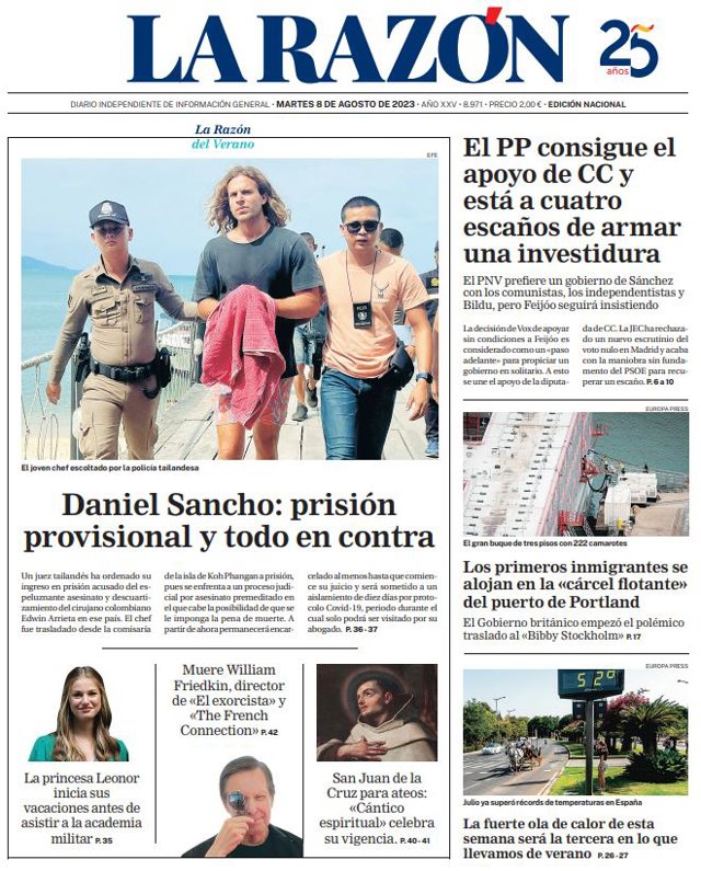 LA RAZÓN: "Daniel Sancho: prisión provisional y todo en contra"; "El PP consigue el apoyo de CC y está a cuatro escaños de armar una investidura"; "Los primeros inmigrantes se alojan en la "cárcel flotante" del puerto de Portland"; "La fuerte ola de calor de esta semana será la tercera en lo que llevamos de verano".