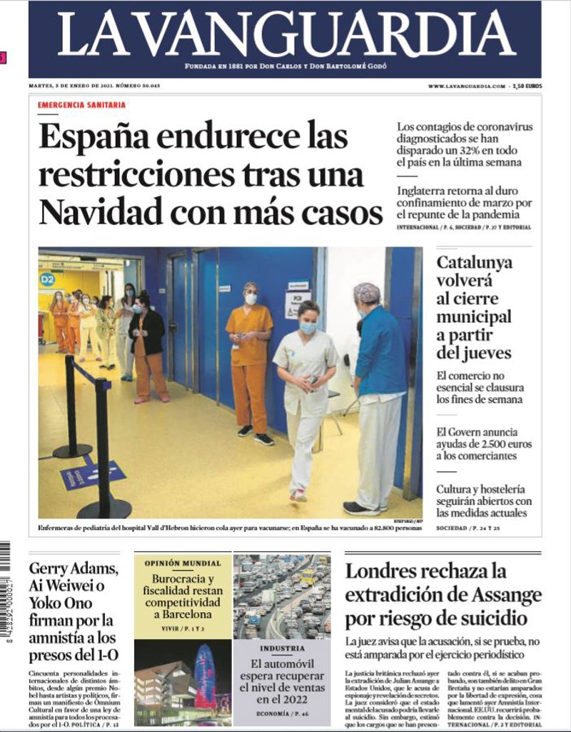LA VANGUARDIA: "España endurece las restricciones tras una Navidad con más casos"; "Catalunya volverá al cierre municipal a partir del jueves"; "Londres rechaza la extradición de Assange por riesgo de suicidio"; "Gerry Adams, Ai Weiwei o Yoko Ono firman por la amnistía a los presos del 1-O"; "Burocracia y fiscalidad restan competitividad a Barcelona"; "El automóvil espera recuperar el nivel de ventas en el 2022".