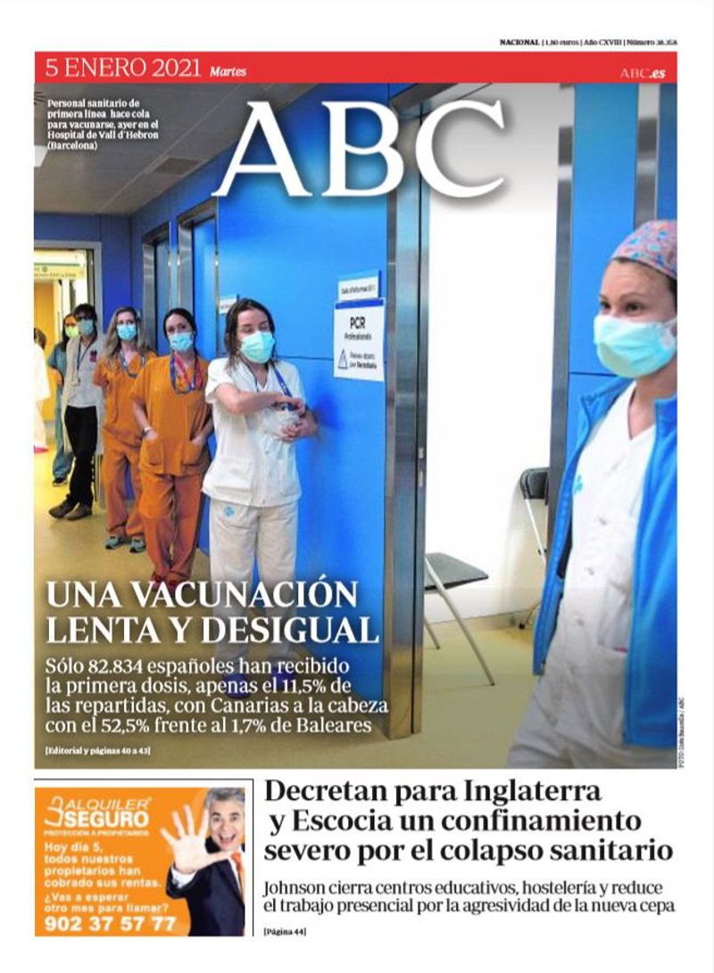 ABC: "Una vacunación lenta y desigual. Sólo 82.834 españoles han recibido la primera dosis, apenas el 11,5% de las repartidas, con Canarias a la cabeza con el 52,5% frente al 1,7% de Baleares"; "Decretan para Inglaterra y Escocia un confinamiento severo por el colapso sanitario. Johnson cierra centros educativos, hostelería y reduce el trabajo presencial por la agresividad de la nueva cepa".