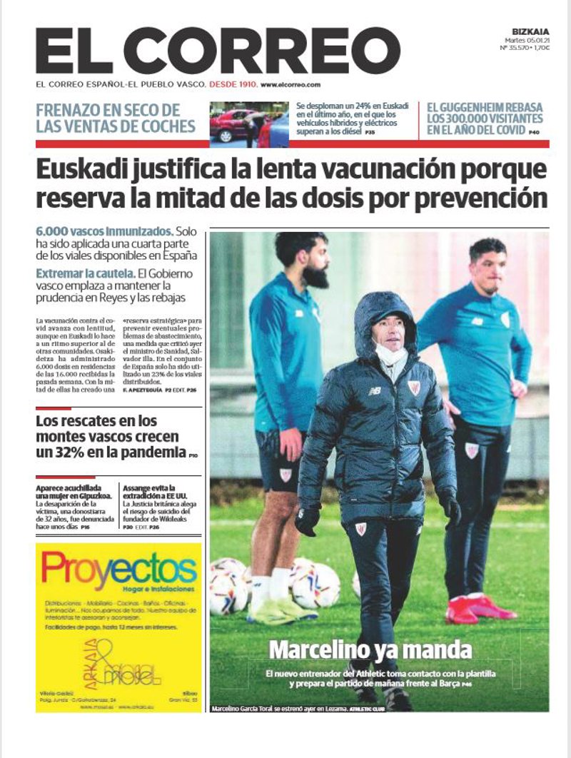 EL CORREO: "Euskadi justifica la lenta vacunación porque reserva la mitad de las dosis por prevención"; "Marcelino ya manda. El nuevo entrenador del Athletic toma contacto con la plantilla y prepara el partido de mañana frente al Barça"; "Los rescates en los montes vascos crecen un 32% en la pandemia".