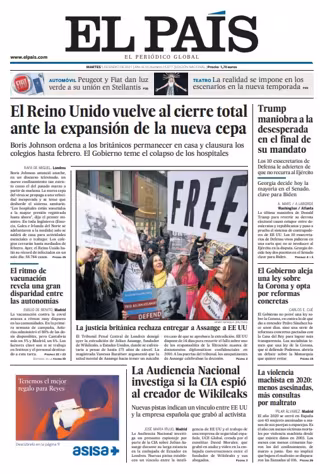 EL PAÍS: "El Reino Unido vuelve al cierre total ante la expansión de la nueva cepa"; "La justicia británica rechaza entregar a Assange a EE UU"; "La Audiencia Nacional investiga si la CIA espió al creador de Wikileaks"; "El ritmo de vacunación revela una gran disparidad entre las autonomías"; "Trump maniobra a la desesperada en el final de su mandato"; "El Gobierno aleja una ley sobre la Corona y opta por reformas concretas"; "La violencia machista en 2020: menos asesinadas,