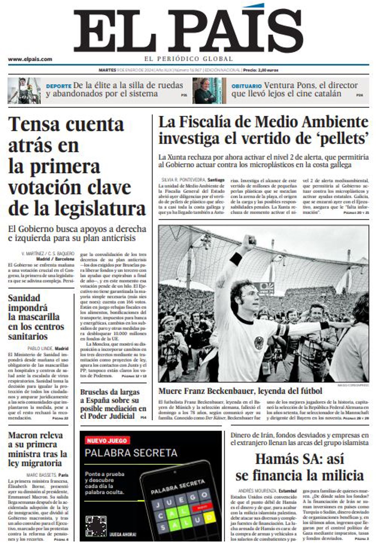 EL PAÍS: "Tensa cuenta atrás en la primera votación clave de la legislatura"; "La Fiscalía de Medio Ambiente investiga el vertido de 'pellets'"; "Sanidad impondrá la mascarilla en los centros sanitarios"; "Macron releva a su primera ministra tras la ley migratoria"; "Hamás SA: así se financia la milicia".