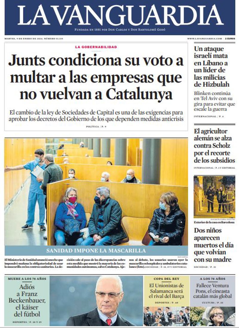 LA VANGUARDIA: "Junts condiciona su voto a multar a las empresas que no vuelvan a Catalunya"; "Un ataque israelí mata en Líbano a un líder de las milicias de Hizbulah"; "El agricultor alemán se alza contra Scholz por el recorte de los subsidios"; "Dos niños aparecen