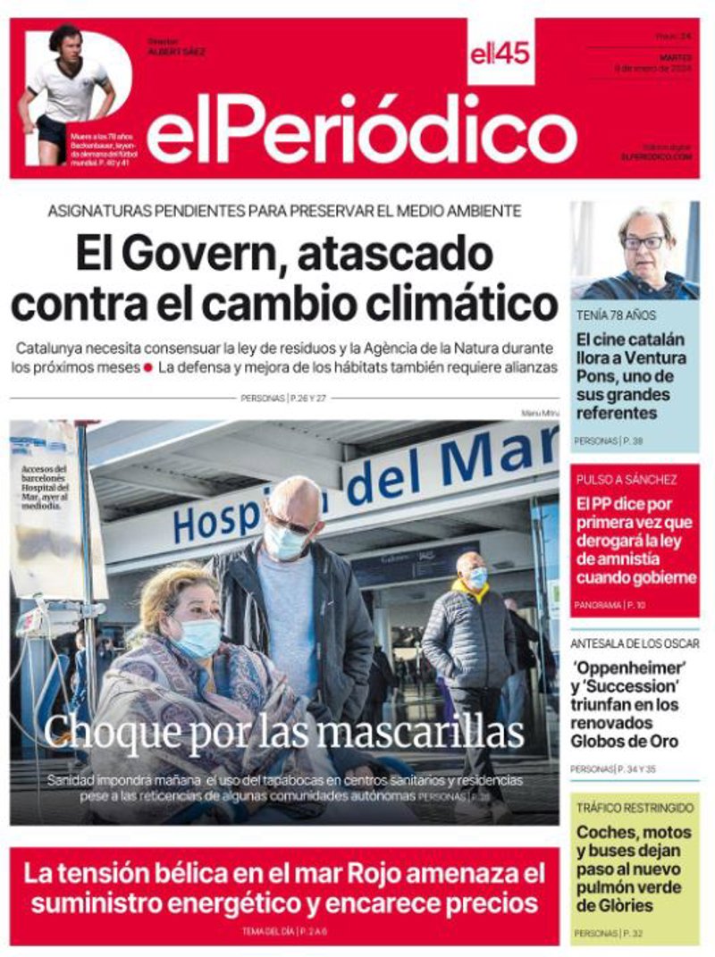 EL PERIÓDICO: "El Govern, atascado contra el cambio climático"; "Choque por las mascarillas"; "La tensión bélica en el mar Rojo amenaza el suministro energético y encarece precios"; "El cine catalán llora a Ventura Pons, uno de sus grandes referentes"; "El PP dice por primera vez que derogará la ley de amnistía cuando gobierne"; "'Oppenheimer' y 'Sucecession' triunfan en los renovados Globos de Oro"; "Coches, motos y buses dejan paso al nuevo pulmón verde de Glòries".